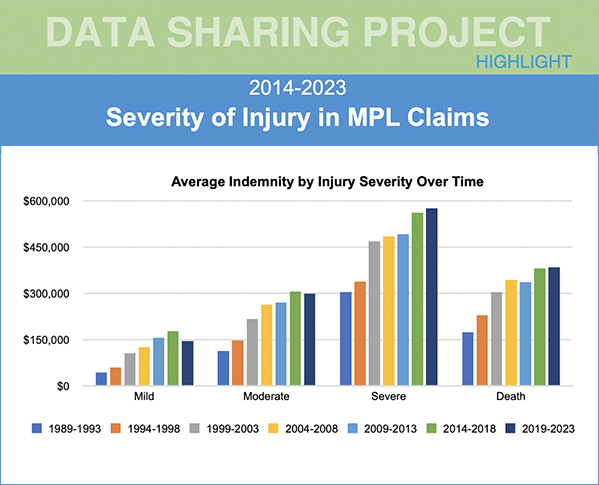 The MPL Association examines closed claims from 2014 to 2023 using injury severity classifications. While mild and moderate injuries account for 55.3% of total closed claim counts, higher severity injuries are associated with higher indemnity payments.