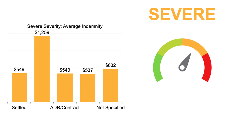 This highlight examines closed MPL claims from 2014 to 2023 using injury severity classifications based on NAIC severity injury codes, combined into four severity categories (mild, moderate, severe, and death) as outlined in Table 1. The data shows that closed with payment (CWP) ratios generally increase with injury severity, with severe injuries reporting the highest CWP ratio at 36% compared to 28% for the overall dataset. While mild and moderate injuries account for 55.3% of total closed claim counts, higher severity injuries are associated with higher indemnity payments with average indemnity 58% higher than the dataset average. Defense costs are incurred across all severities, including claims that do not result in indemnity payments. Severe injuries were also associated with higher defense costs, 44% higher than the overall average. The last figure illustrates MPL costs by claim resolution and highlights the five most common resulting medical conditions (outcomes) among paid claims for each claim severity classification.