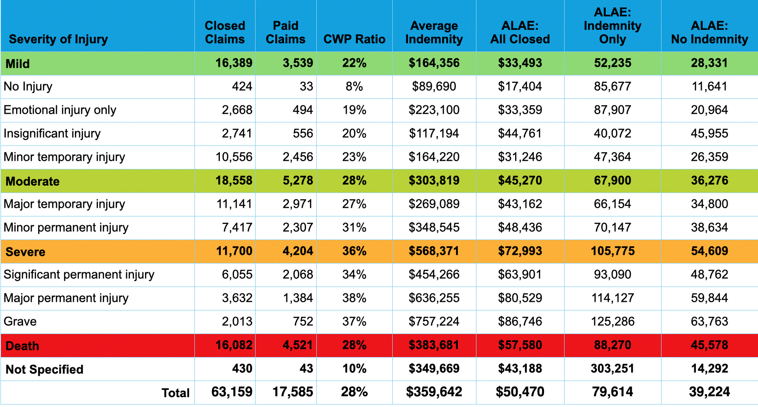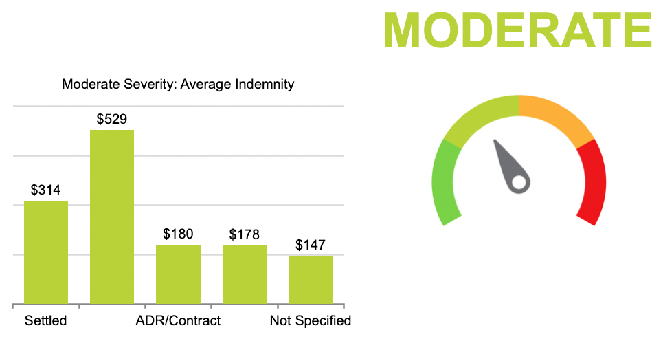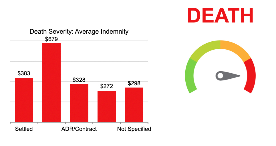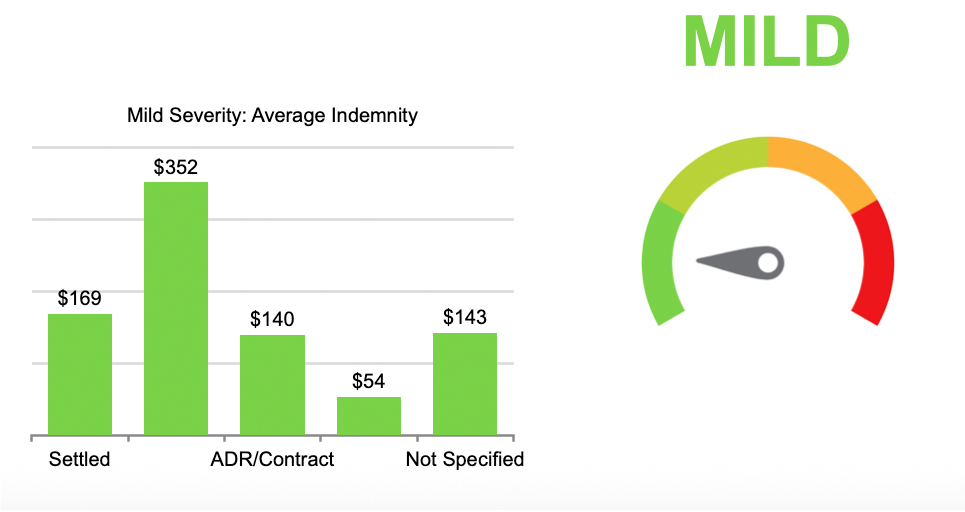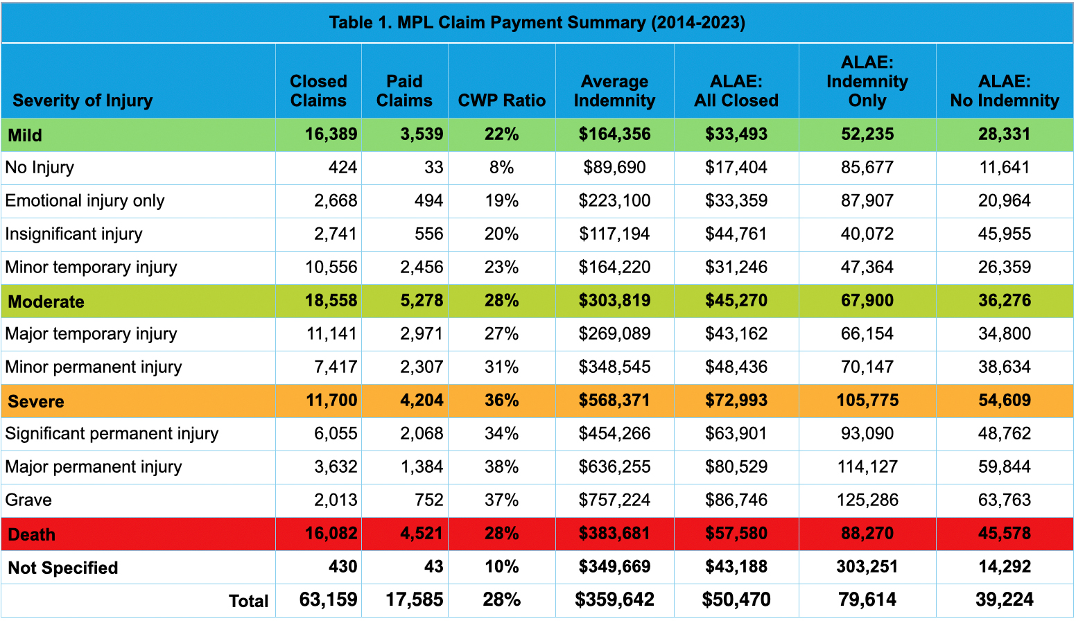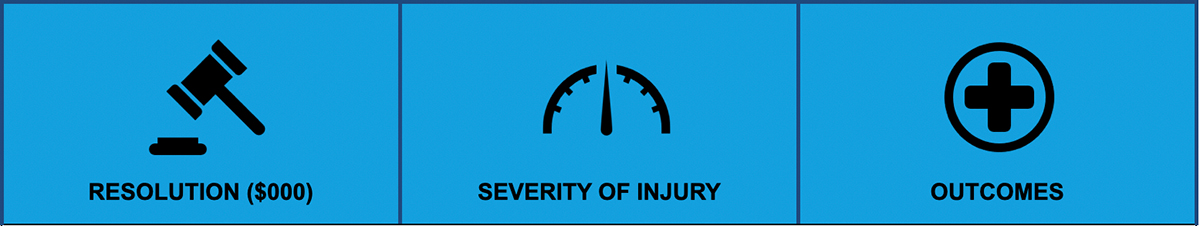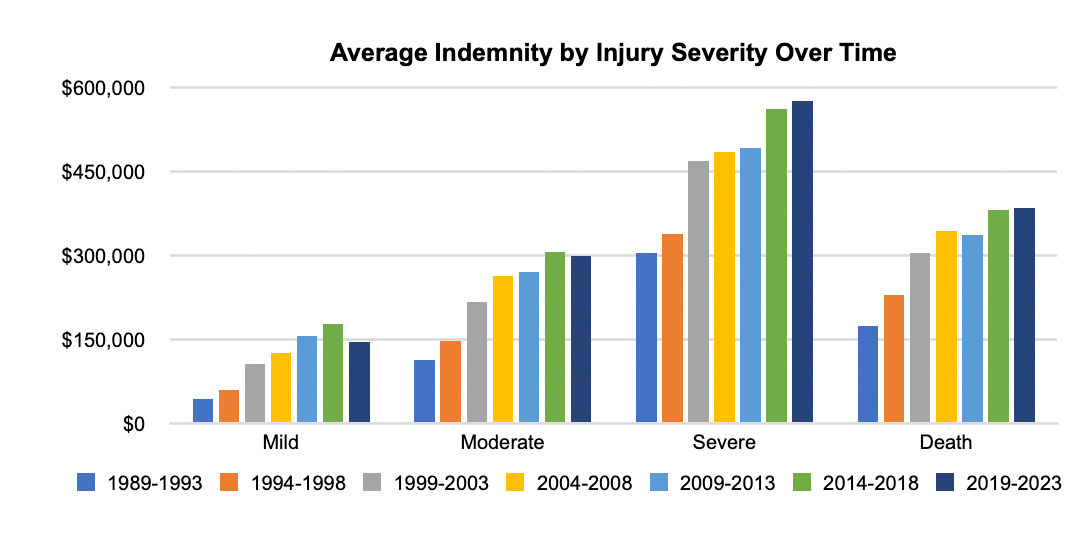 This highlight examines closed MPL claims from 2014 to 2023 using injury severity classifications based on NAIC severity injury codes, combined into four severity categories (mild, moderate, severe, and death) as outlined in Table 1. The data shows that closed with payment (CWP) ratios generally increase with injury severity, with severe injuries reporting the highest CWP ratio at 36% compared to 28% for the overall dataset. While mild and moderate injuries account for 55.3% of total closed claim counts, higher severity injuries are associated with higher indemnity payments with average indemnity 58% higher than the dataset average. Defense costs are incurred across all severities, including claims that do not result in indemnity payments. Severe injuries were also associated with higher defense costs, 44% higher than the overall average. The last figure illustrates MPL costs by claim resolution and highlights the five most common resulting medical conditions (outcomes) among paid claims for each claim severity classification.